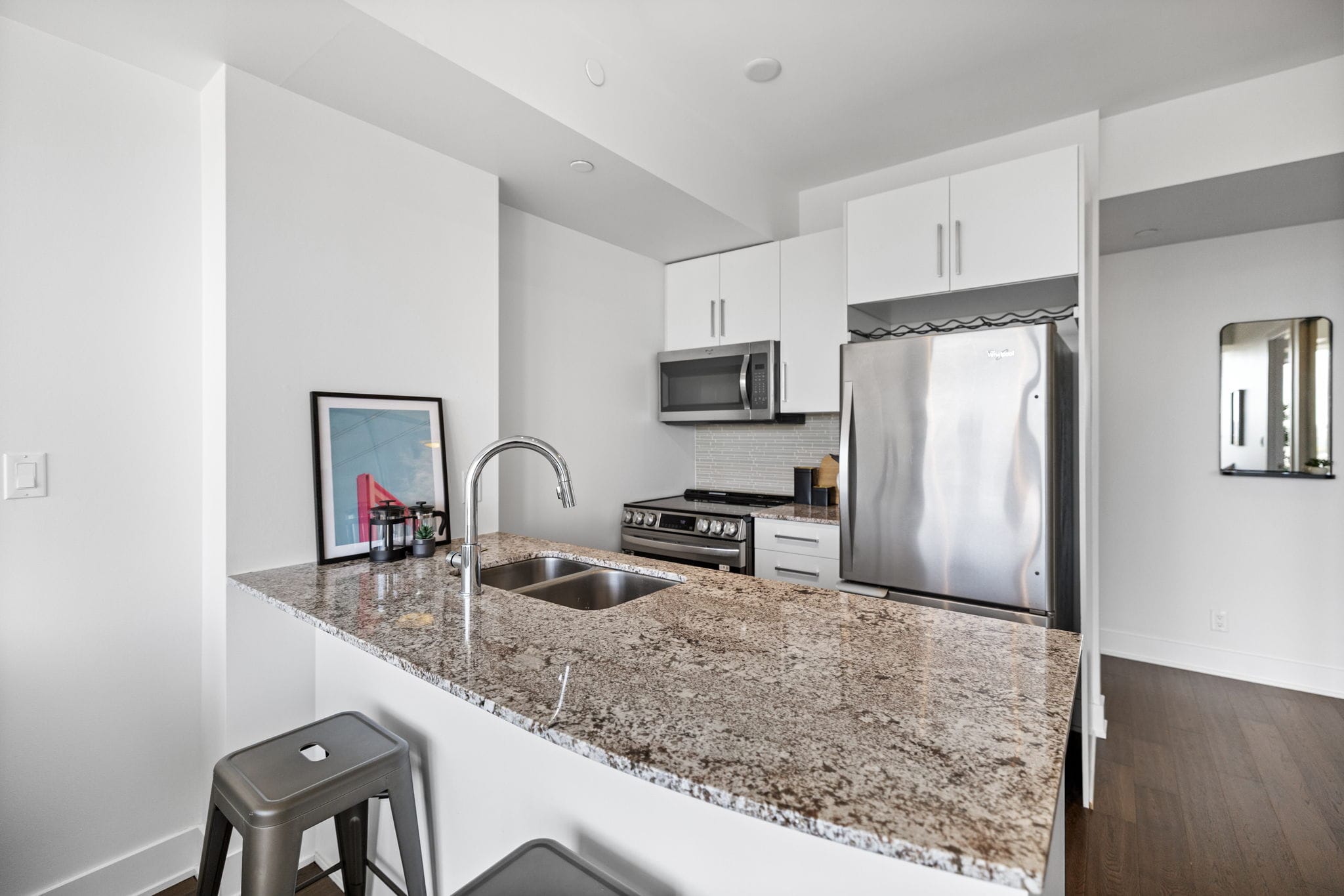 Recent upgrades add style and comfort, including a chic kitchen backsplash, upgraded countertops, modern cabinet hardware, new flooring, and elegant Zen mirror sliding doors. Window fixtures are also included for your convenience.