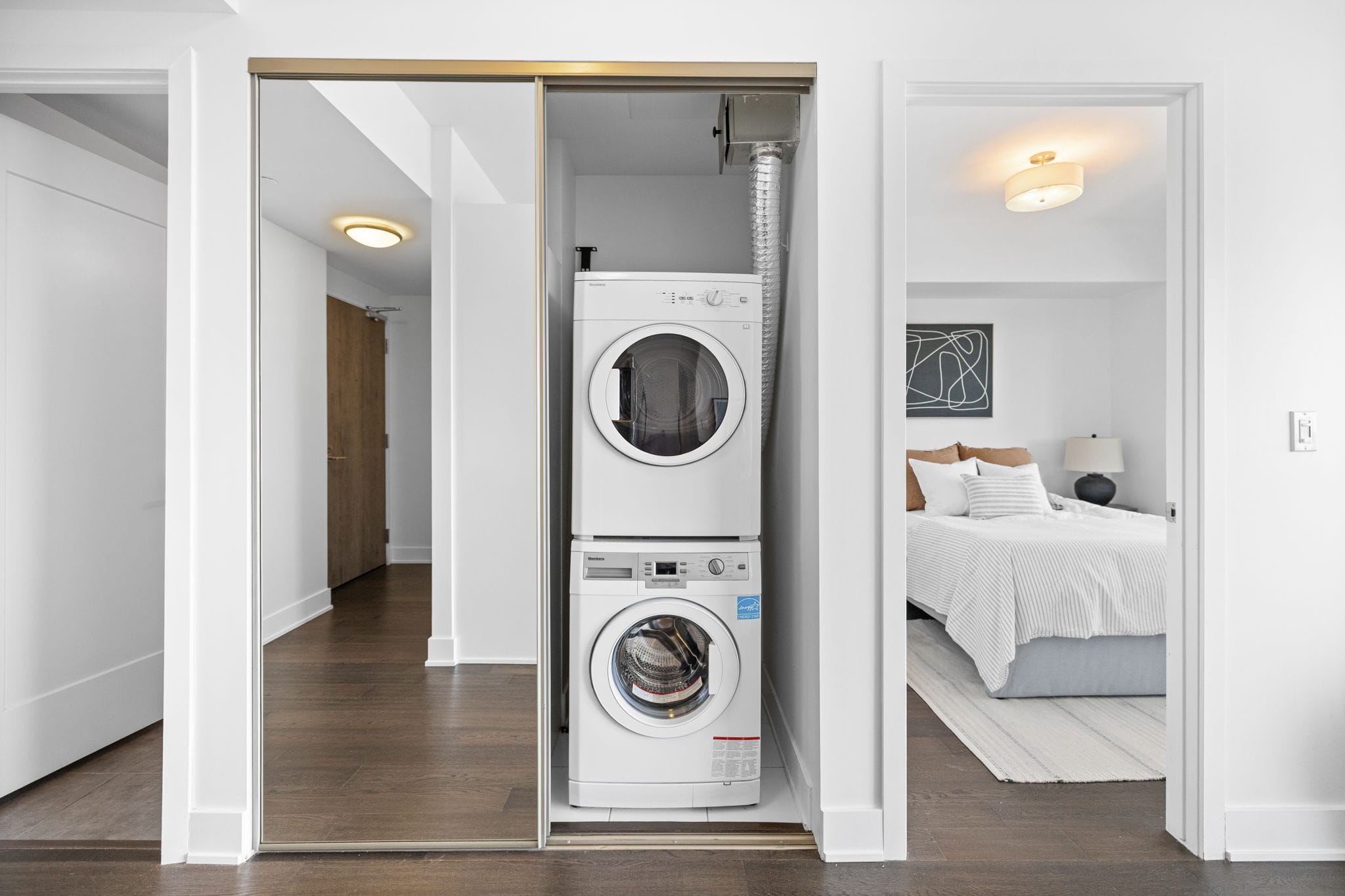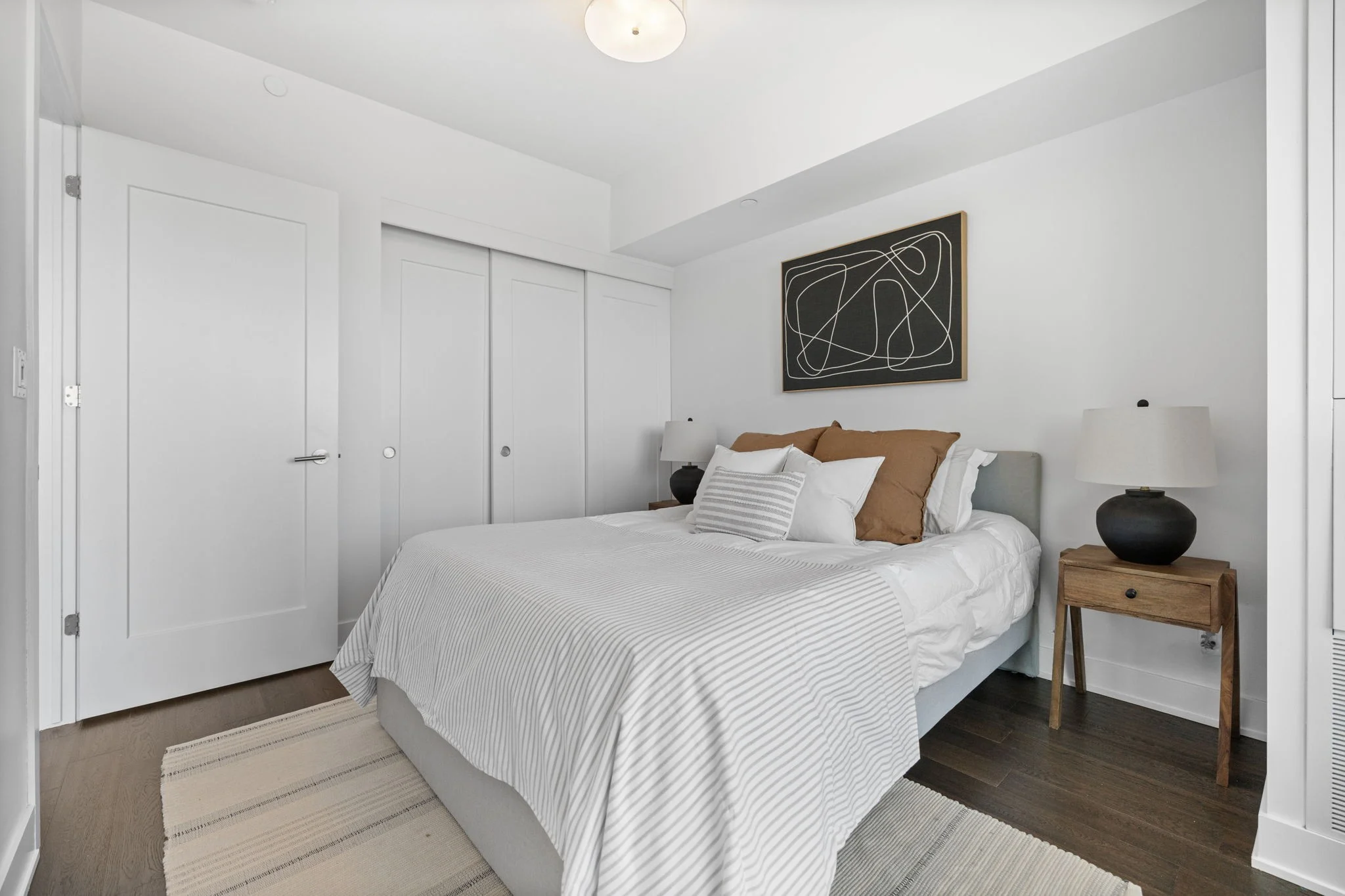 The spacious bedroom offers a large closet, providing plenty of storage. The unit also features a modern 3‑piece bathroom finished with elegant quartz countertops.