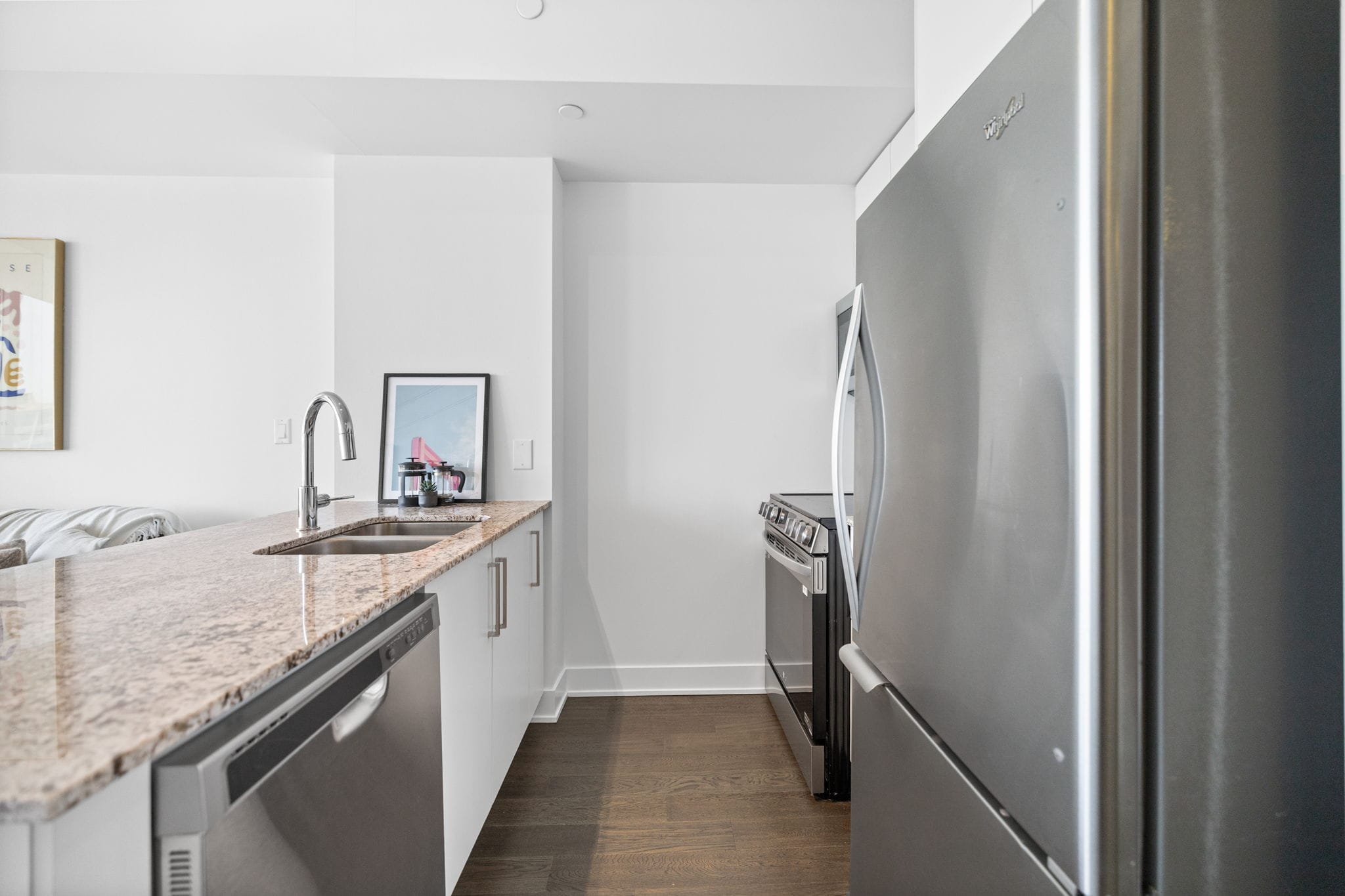 The kitchen is thoughtfully designed with stainless steel appliances and sleek quartz surfaces, perfect for cooking and entertaining. Additional highlights include in‑suite laundry and a generous south‑facing balcony that offers stunning views and abundant sunshine.